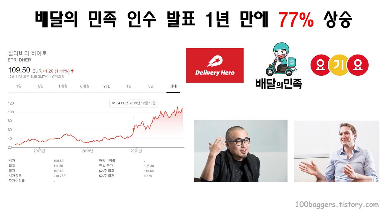 2019년 12월 13일, 배달의 민족은 독일 딜리버리 히어로에 지분 87%를 4조 7,500억 원에 매각하기로 발표했습니다. 당일 독일 증시에서 딜리버리 히어로 주가는 23.3% 떡상하여 61.84 유로. 이날 못 잡았다 하더라도, 그다음 거래일인 12월 16일 종가로 매수했으면 64.5유로.