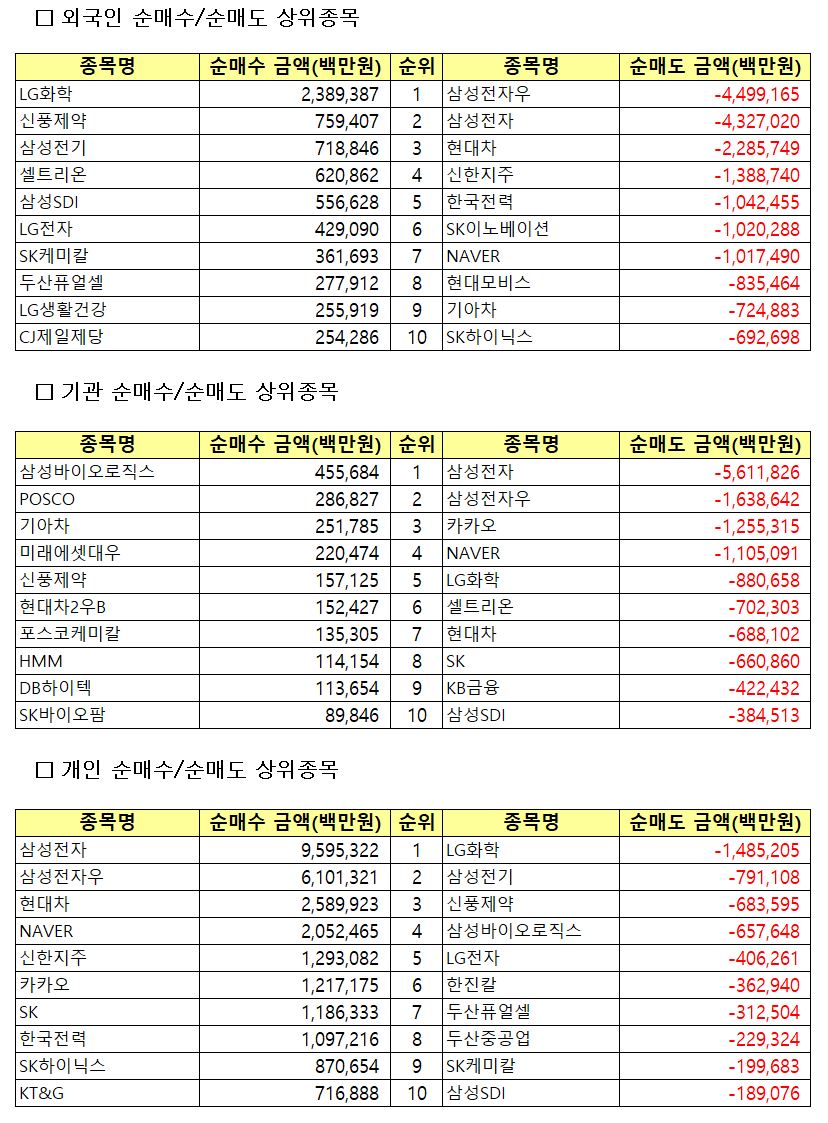 7. 외국인 LG화학, 기관 삼성바이오로직스, 개인 삼성전자 순매수!