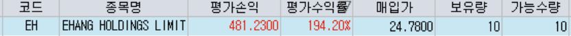 UAM(Urban Air Mobility)의 가능성을 믿고 이항(EH)을 소량 매수했는데, 너무 떡상해버리니 무섭네요. 10주가 아니라 1,000주를 샀어야 했는데. 뭐 또 기회가 오겠죠. 이렇게 얻어걸리면 기분이 매우 좋더라고요.