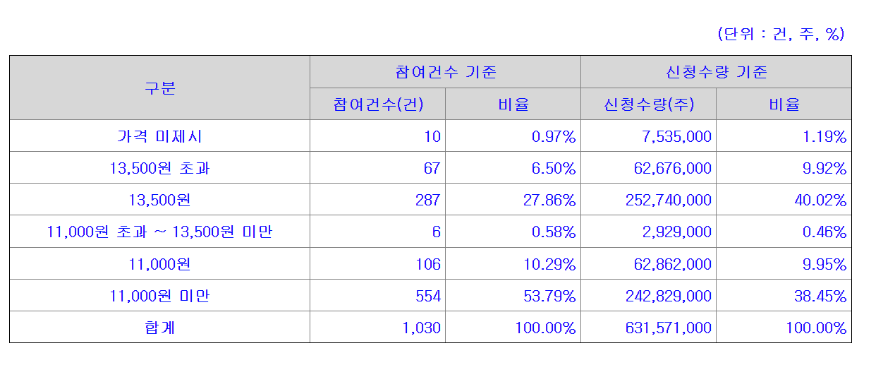 14. 기관투자자 청약 경쟁률은 500대 1에 불과했다. 나쁘지는 않은 숫자인데 1,000대 1 정도 나와줘야 수요예측에 성공했다고 평가받는다.
